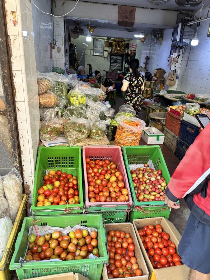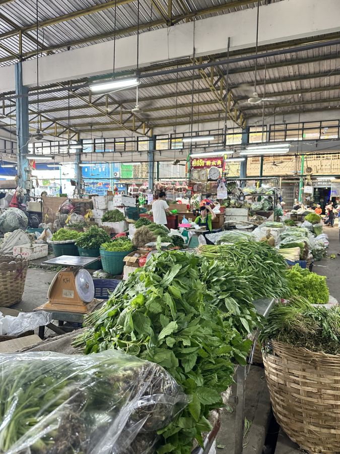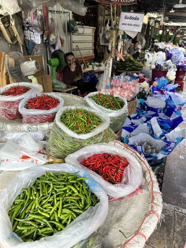Neben den Blumen gibt es auf dem Markt auch eine Fülle von frischem Gemüse und Gewürzen. Die scharfen Chilis sind besonders bekannt und werden oft in der thailändischen Küche verwendet. Die Stände bieten eine bunte Auswahl an frischem Obst und Gemüse, das von den örtlichen Bauern geliefert wird.