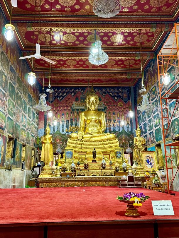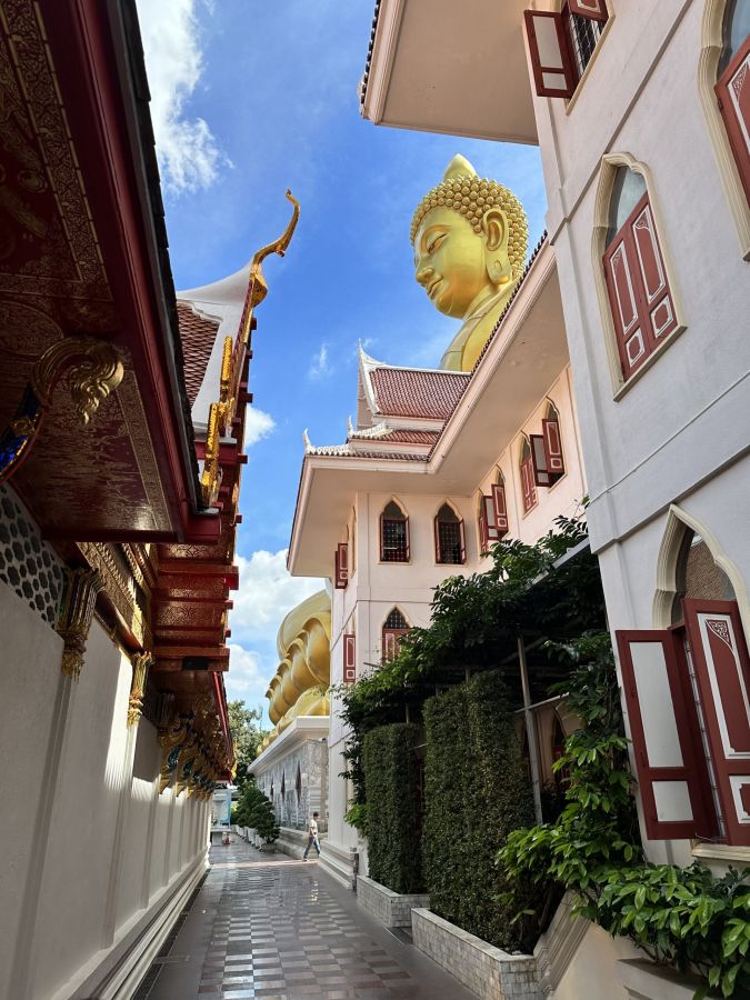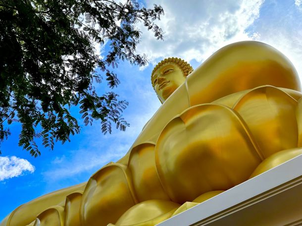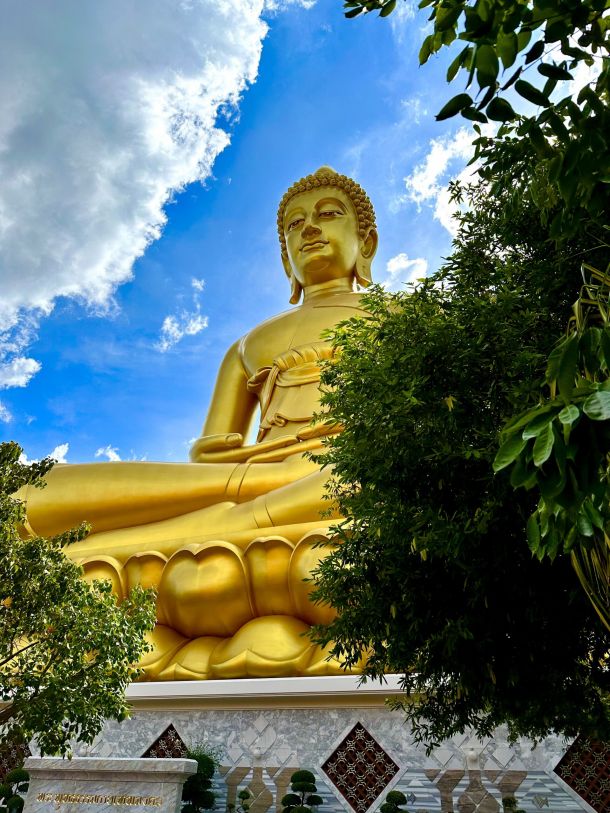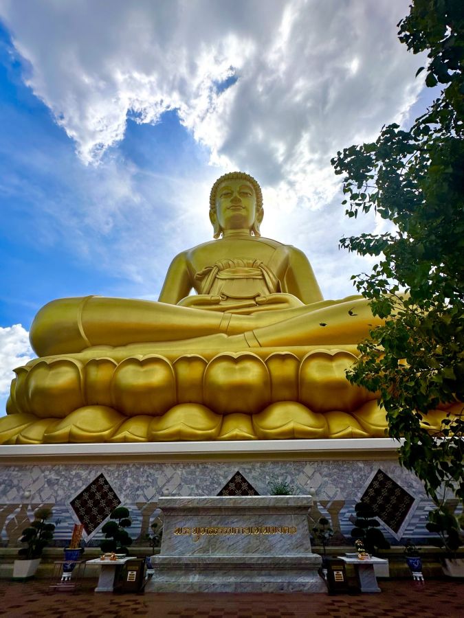 Eines der beeindruckendsten Highlights des Tempels ist zweifellos die riesige goldene Buddha-Statue, die majestätisch inmitten des Geländes thront. Mit einer Höhe von beeindruckenden 69 Metern und einer Breite von 40 Metern und seinem strahlenden Goldglanz, der im Sonnenlicht schimmert, ist dieser Buddha ein Symbol für Erleuchtung und spirituelle Kraft.