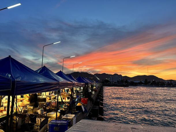 Was den Saphan Pla Night Market in Hua Hin so besonders macht, ist seine Lage am Fishing Pier. Hier kann man den Sonnenuntergang über dem Meer bewundern, während man sich durch die Köstlichkeiten probiert. Der Anblick der Sonne, die langsam im Horizont versinkt, verleiht dem Abend eine romantische und entspannte Atmosphäre.