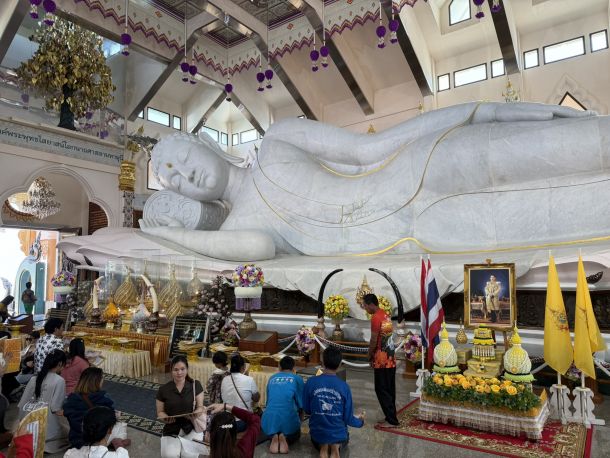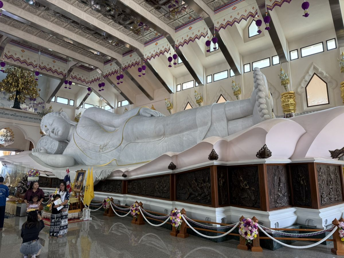 Besonders beeindruckend ist die riesige liegende Buddha-Statue, die aus weißem Marmor gefertigt wurde. Sie strahlt eine unglaubliche Ruhe aus und ist das Herzstück der Tempelanlage. Die filigranen goldenen Verzierungen und die harmonischen blauen Dächer des Tempels machen ihn zu einem der schönsten modernen Tempel Thailands.