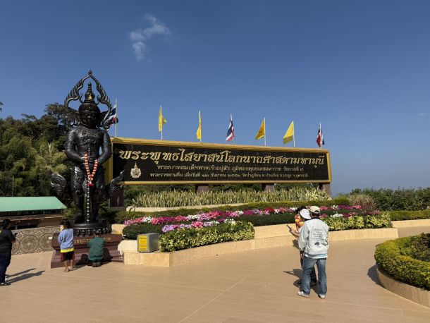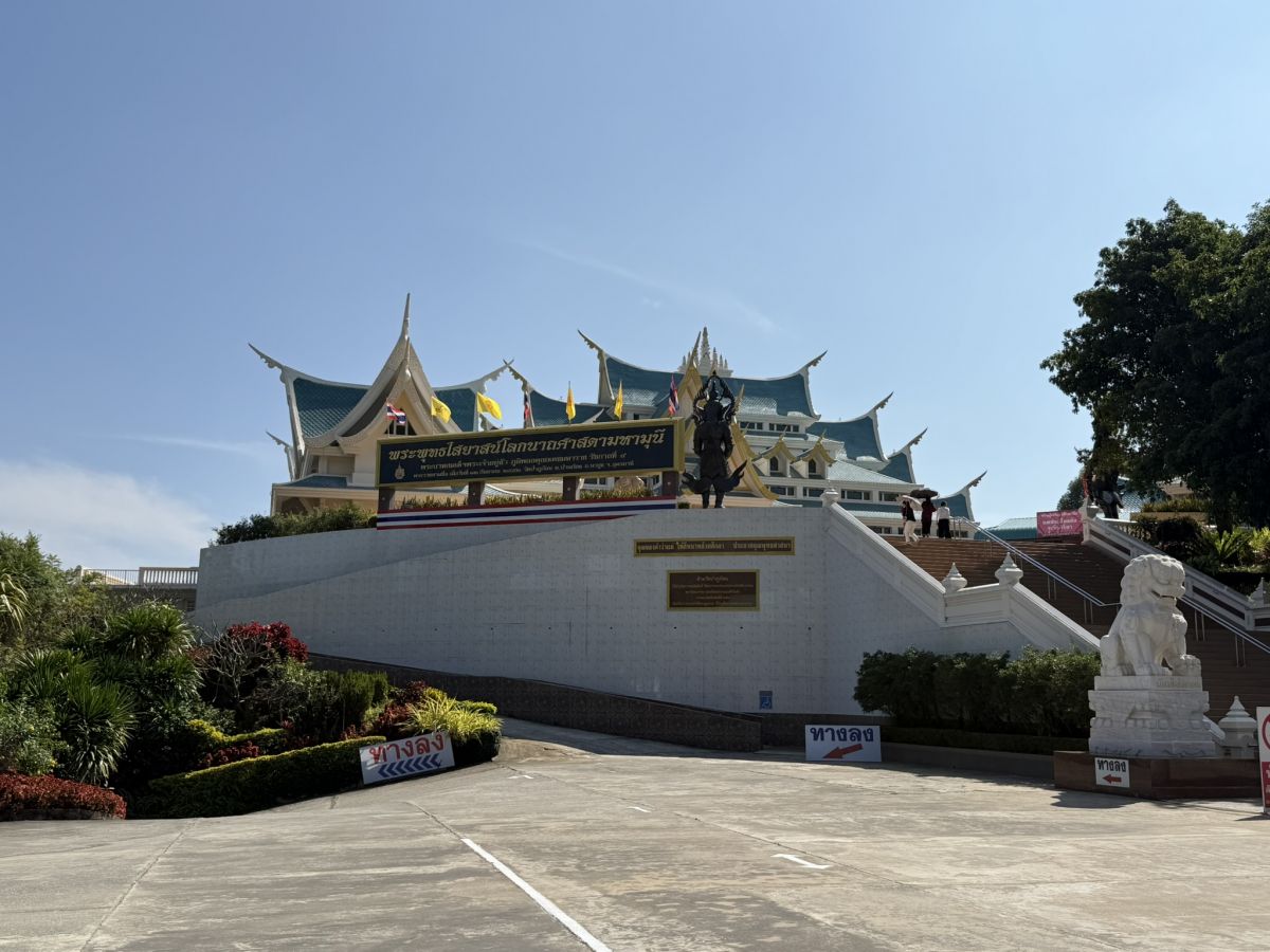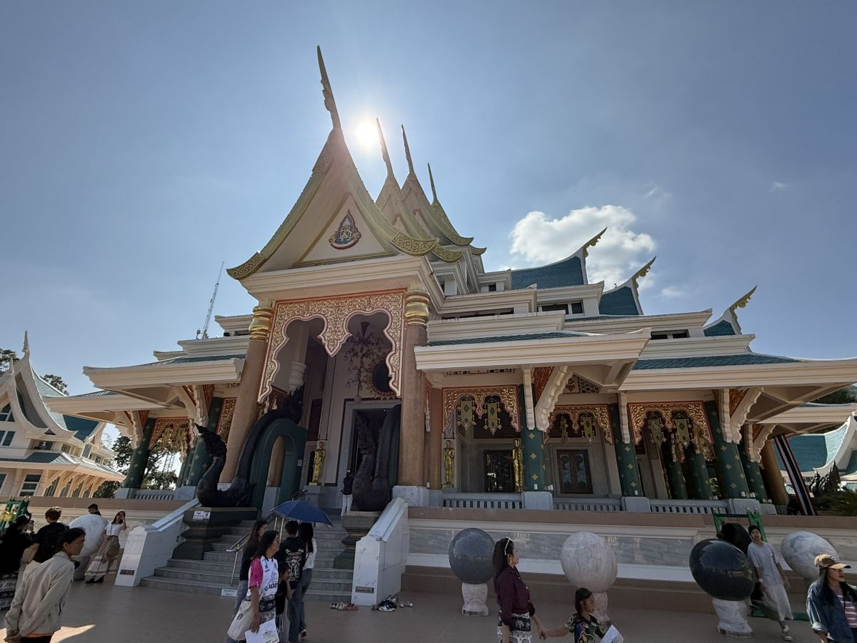 Die Anreise zum Wat Pa Phu Kon ist bereits ein Erlebnis für sich. Eine kurvenreiche Straße führt dich durch dichte Wälder und grüne Hügel, bis du schließlich vor der imposanten Tempelanlage stehst. Der Tempel wurde erst vor wenigen Jahren fertiggestellt und dient als Ort der Meditation und Einkehr.